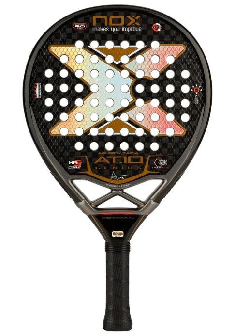 NOX AT10 Luxury Genius Padel racket is developed in collaboration between Agustin Tapia and NOX. The racket is teardrop-shaped and has the sweetspot placed medium high in the racket, which gives good power.